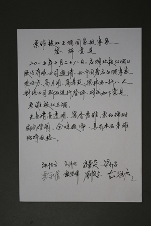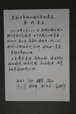 專家們?cè)诩w品評(píng)了柔雅“枝江王”和柔雅“百年枝江”后,給予了這兩大單品很高的評(píng)價(jià)。中國(guó)釀酒大師、中國(guó)白酒專家委員會(huì)專家賴登燡先生當(dāng)場(chǎng)揮毫寫(xiě)下“韻雅香遠(yuǎn)”,還送給枝江酒業(yè)幾幅楹聯(lián):一枝清流融江水,千載風(fēng)雅醉華夏;枝頭明月清輝籠乾坤,江上春風(fēng)香醇流千載。行云流水的行草,蒼勁中有清秀,灑脫中有內(nèi)斂。無(wú)論是內(nèi)容還是筆墨,都與枝江酒的風(fēng)格相一致,表達(dá)了與會(huì)專家對(duì)枝江酒業(yè)的深情厚誼。