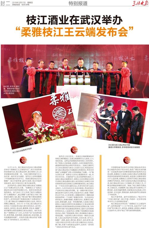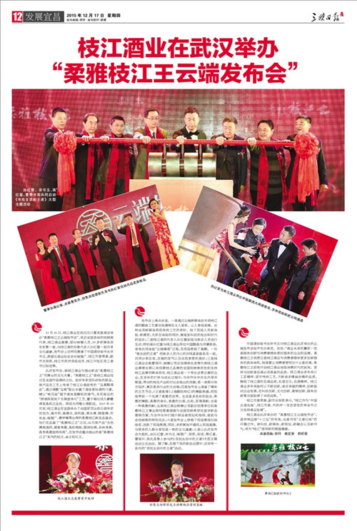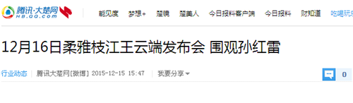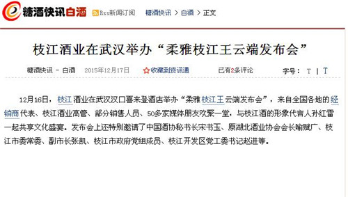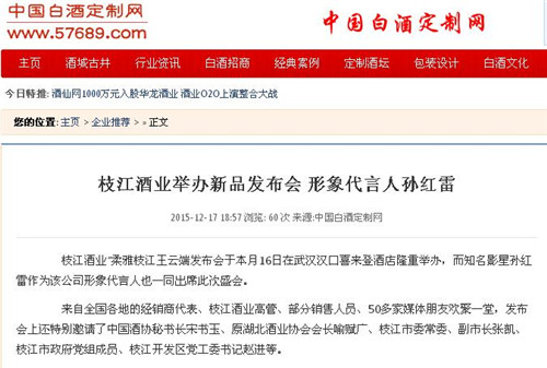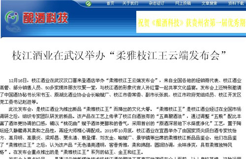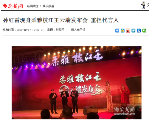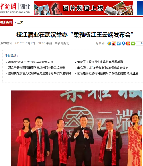 枝江酒業(yè)1216日在武漢漢口喜來登酒店舉辦的“柔雅枝江王云端發(fā)布會”,受到了媒體界朋友的廣泛關(guān)注。兩天來,有近百家媒體報道和轉(zhuǎn)載。有新華網(wǎng)湖北、中新網(wǎng)湖北、騰訊大楚網(wǎng)、光明網(wǎng)、新民網(wǎng)、新浪、搜弧、中國網(wǎng)湖北、荊楚網(wǎng)、消費日報網(wǎng)、釀酒科技、長江網(wǎng)、漢網(wǎng)、糖酒快訊、中國酒業(yè)、中華網(wǎng)、第一農(nóng)經(jīng)等網(wǎng)絡(luò)媒體,有湖北日報、武漢晨報、三峽日報、三峽晚報、三峽商報、湖北畫報等報紙媒體;有枝江酒業(yè)1216日在武漢漢口喜來登酒店舉辦的“柔雅枝江王云端發(fā)布會”,受到了媒體界朋友的廣泛關(guān)注。兩天來,有近百家媒體報道和轉(zhuǎn)載。有新華網(wǎng)湖北、中新網(wǎng)湖北、騰訊大楚網(wǎng)、光明網(wǎng)、新民網(wǎng)、新浪、搜弧、中國網(wǎng)湖北、荊楚網(wǎng)、消費日報網(wǎng)、釀酒科技、長江網(wǎng)、漢網(wǎng)、糖酒快訊、中國酒業(yè)、中華網(wǎng)、第一農(nóng)經(jīng)等網(wǎng)絡(luò)媒體,有湖北日報、武漢晨報、三峽日報、三峽晚報、三峽商報、湖北畫報等報紙媒體;有湖北電視臺、三峽電視臺、枝江電視臺等電視媒體;有“玩轉(zhuǎn)宜昌”、“酒說”等眾多微信平臺。尤其是微信新媒體,傳播快,關(guān)于“柔雅枝江王云端發(fā)布會”的報道被眾多關(guān)注枝江酒業(yè)、關(guān)注柔雅枝江王新品的消費者和孫紅雷的粉絲刷屏。湖北電視臺、三峽電視臺、枝江電視臺等電視媒體;有“玩轉(zhuǎn)宜昌”、“酒說”等眾多微信平臺。尤其是微信新媒體,傳播快,關(guān)于“柔雅枝江王云端發(fā)布會”的報道被眾多關(guān)注枝江酒業(yè)、關(guān)注柔雅枝江王新品的消費者和孫紅雷的粉絲刷屏。